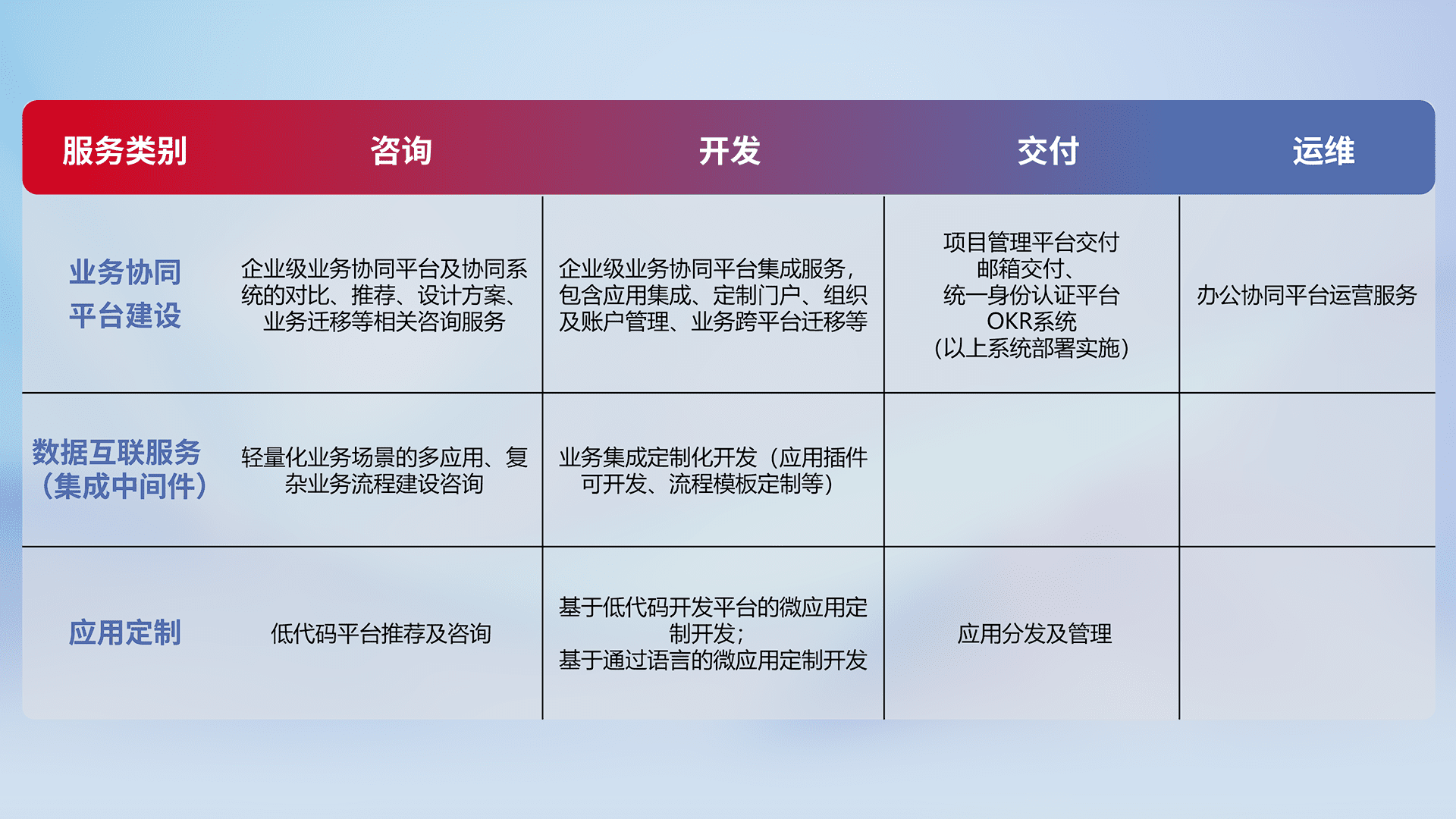 针对钉钉、、、企微、、、、IDaas等平台级产品提供产品的规划、、、方案、、交付、、定制化开发等服务,,,,实现如统一协同办公、、、智能客户服务、、、混合会议管理、、、、智能数据查询、、等业务场景,,,实现数字化转型。。。。